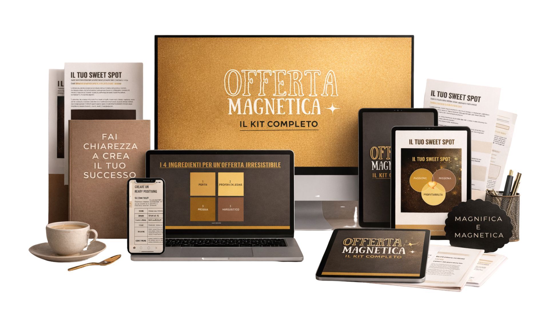 Se sei qui, probabilmente senti che hai tanto valore da offrire, ma non sai come organizzarlo e comunicarlo in modo che attiri i clienti giusti. Ti capisco perfettamente, ed è proprio per questo che ho creato Offerta Magnetica. Il Kit completo.