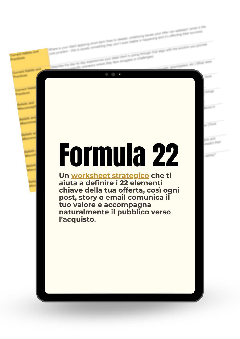 Un worksheet strategico che ti aiuta a definire i 22 elementi chiave della tua offerta, così ogni post, story o email comunica il tuo valore e accompagna naturalmente il pubblico verso l’acquisto.