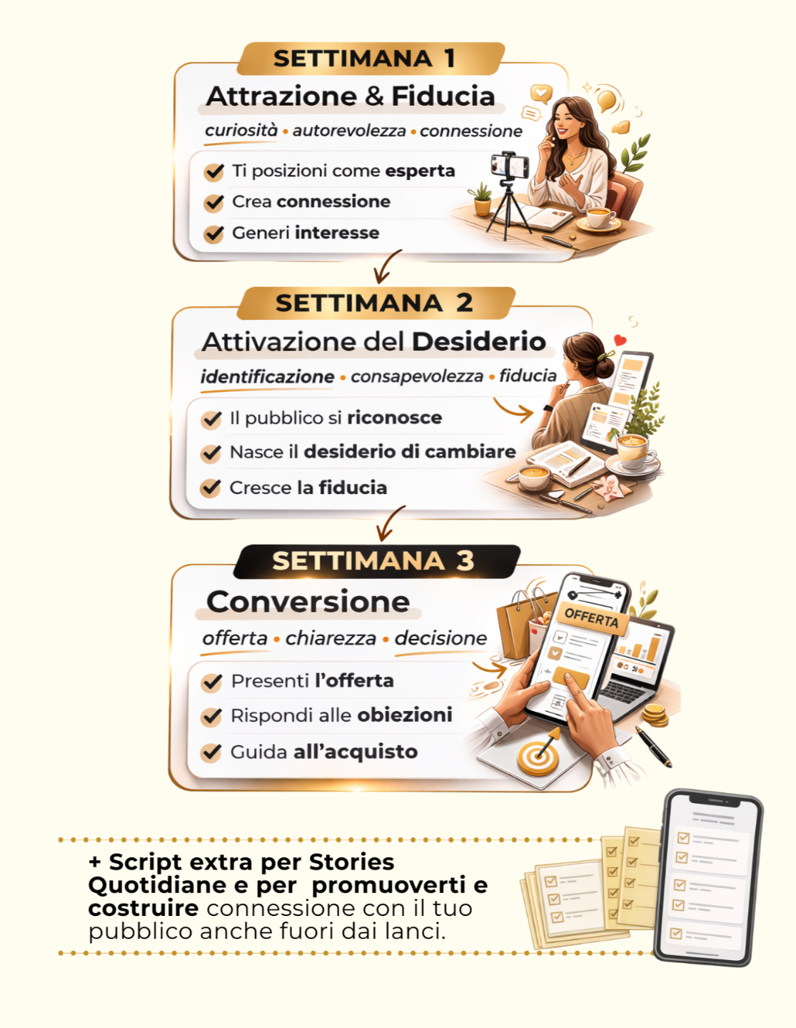 Una sequenza strategica basata sulla psicologia della vendita che guida il tuo pubblico attraverso le fasi che attivano il comportamento d’acquisto — curiosità → connessione → desiderio → acquisto — con Stories già scritte e script parola per parola che puoi adattare alla tua offerta in pochi minuti.